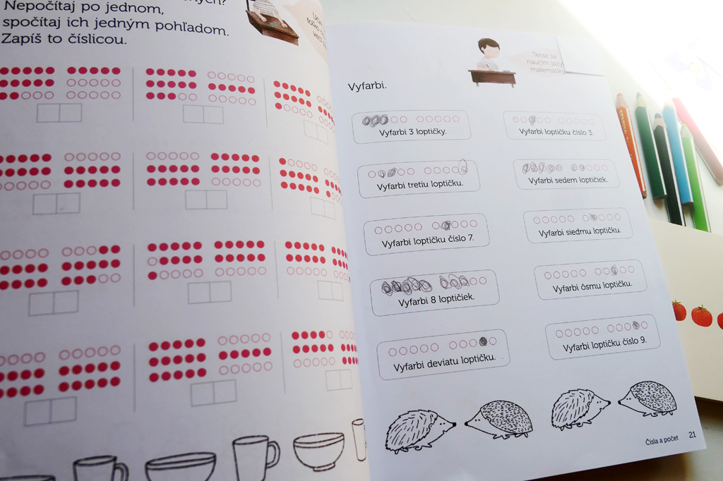 Učebnica má 4 diely zamerané na kreslenie v mriežke, logické myslenie a samotné počítanie na začiatok s pomocným počítadlom. V rukách sme ju mali prvýkrát v 4 rokoch a priebežne sa k nej vracali, najčastejšie v rámci hry na školu. Pani učiteľka Sova vyvolávala žiačikov, a Hanka za každého vypĺňala políčka. Každý kamarát má svoju povahu. Oli rieši zadanie bláznivo, Emka poctivo, Magda je hanblivá, Kitty ešte príliš malá a môže sa pomýliť.