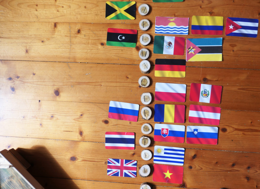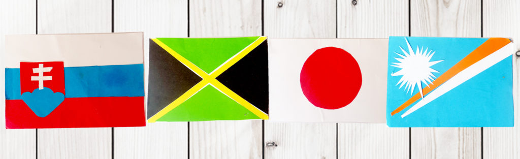 V jednom zo starých školských atlasov Janko objavil zoznam vlajok všetkých krajín. Rozhodli sme sa, že si niektoré vyrobíme sami z farebného papiera. Nepoznám zatiaľ lepšiu formu ako deti hravo, nenútene a s takým širokým kontextom naučiť rozoznávať základné geometrické tvary a ikony, rozumieť symbolike farieb, ale aj geografickému či politickému usporiadaniu sveta. Samozrejme každý kontinent aj krajina má svoje špecifiká, čím exotickejšie, tým lepšie na zapamätanie.