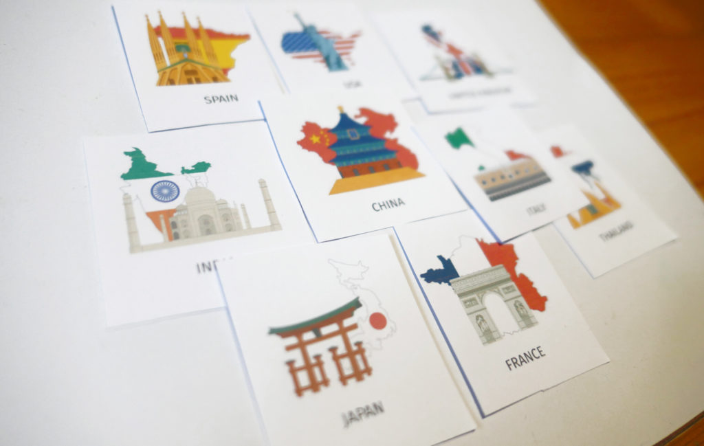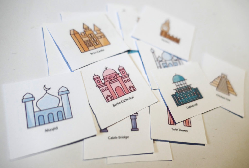 Montesorri klasika. Kartičky s dominantami miest a hlavnými mestami rôznych štátov.