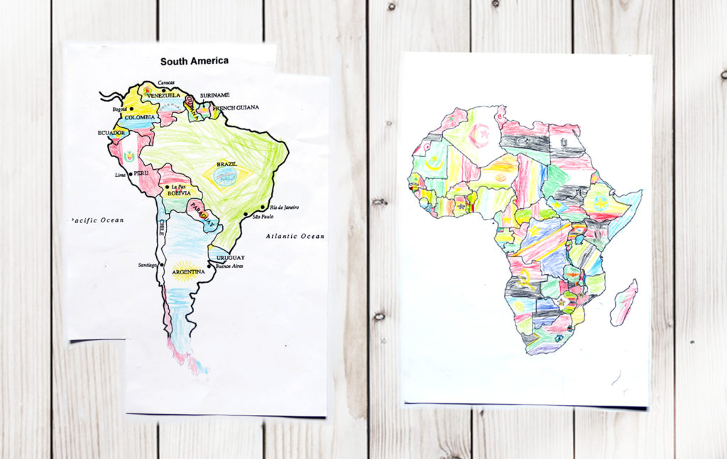 Základná obrysová mapa kontinentu a obľúbené vkresľovanie vlajok. Zábava na niekoľko hodín. Vystačíte si so základnými farbami a veľkou dávkou trpezlivosti.