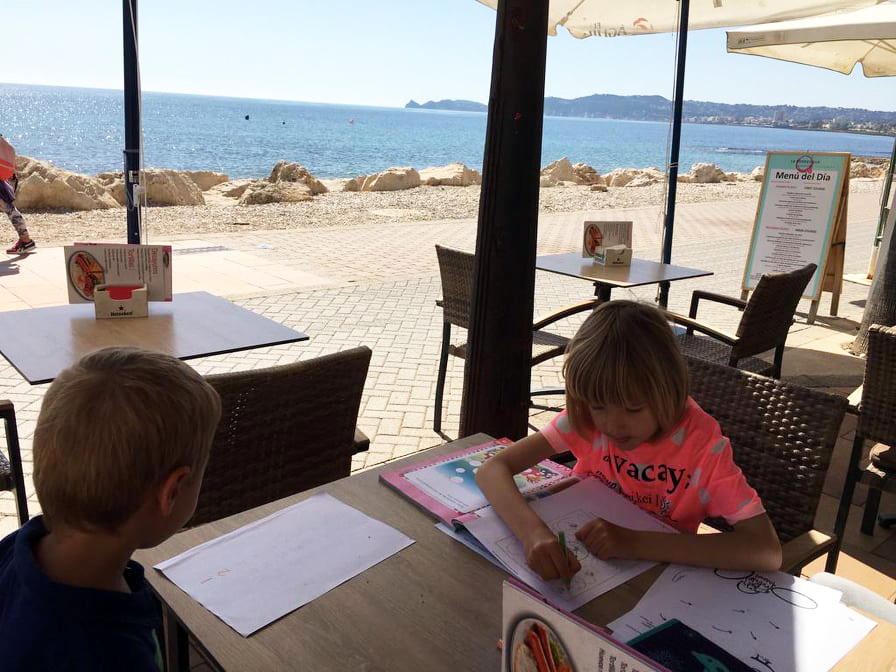 Nezabudli sme ani na Hankine predškolácke povinnosti, precvičovanie jemnej motoriky a opakovanie základných vedomostí. Keďže zlé počasie pominulo, učiť sme sa začali v kaviarne na káve s výhľadom na more.